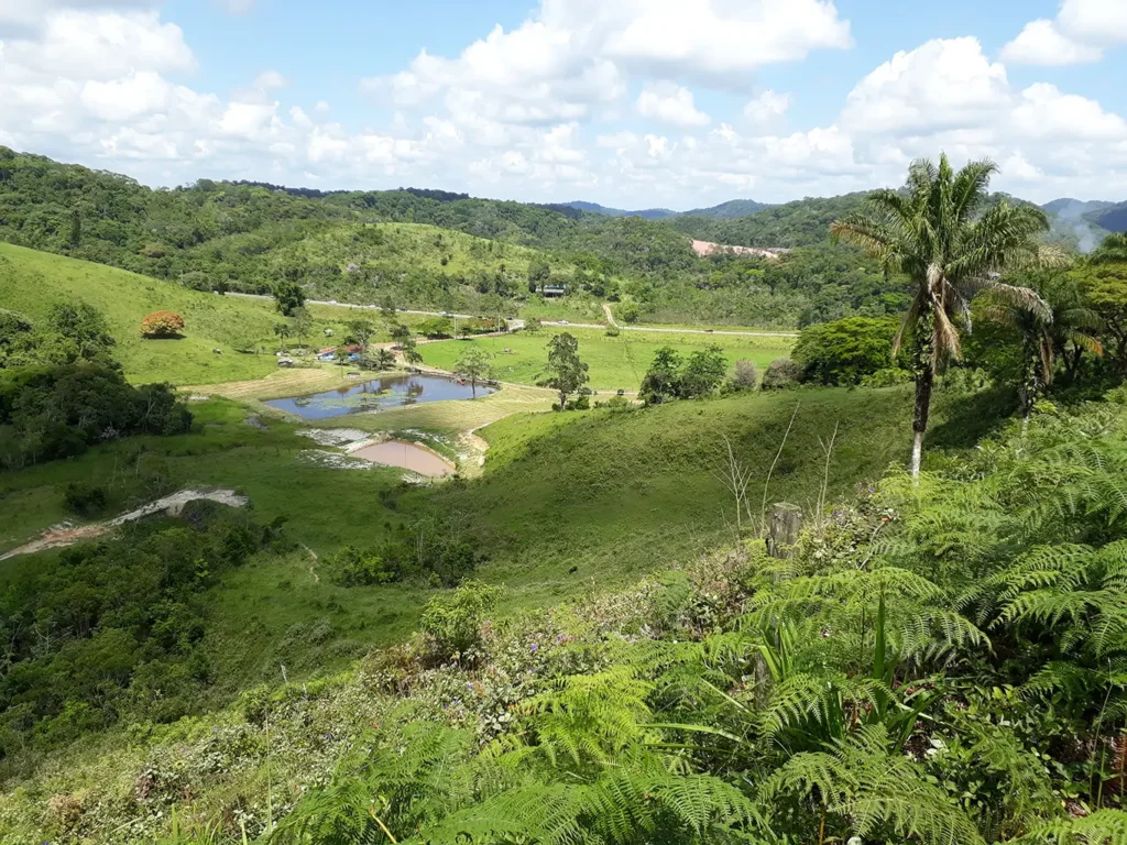 Com uma área total de 412 ha, a propriedade mantém 270 ha de florestas conservadas, em mosaico com plantios de pupunha, pastagens para búfalas, tanques de criação de tilápias, além de lago para fins recreacionais e pomar com bananeiras e outras frutíferas.
